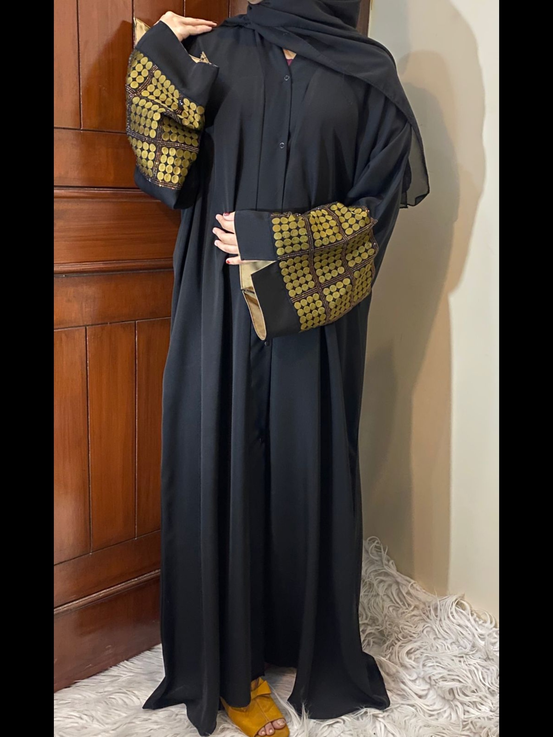 Make a bold statement with our Zari Embroidered Black Abaya, designed for women who appreciate elegance and tradition. This stunning abaya features wide sleeves with luxurious golden zari embroidery in a modern circular pattern, offering a unique blend of traditional craftsmanship and contemporary modest fashion.