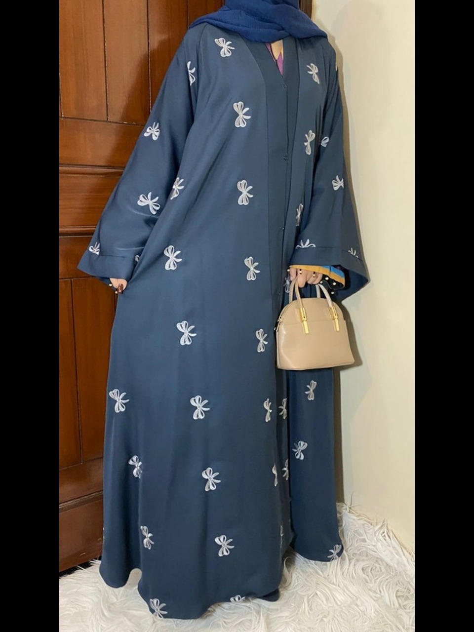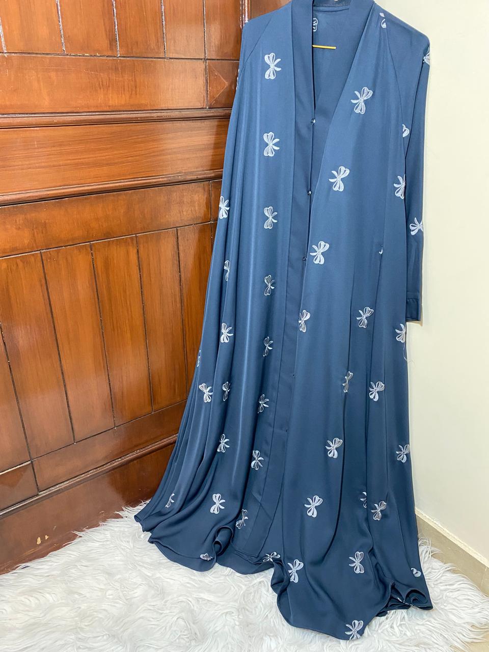 This navy blue abaya features a flowy silhouette with delicate white embroidery all over. Designed with a front-open button style, it blends elegance and comfort, making it perfect for both casual and formal wear.